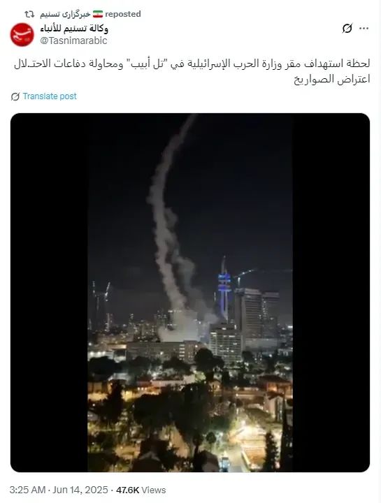 当地时间14日,以色列已再次开始袭击伊朗境内的目标。伊朗首都德黑兰已启动防空系统拦截以色列的导弹。