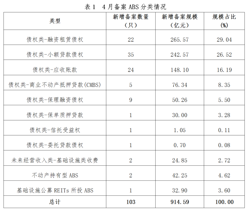 中基协:4月资产支持专项计划新增备案103只 新增备案规模合计914.59亿元