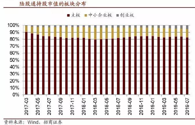 来自招商证券的测算统计显示,截至7月末,北向资金在A股的持股总市值为10544亿元,较前一个月小幅提高139亿元。分板块看,主板持股市值占比为82.63%,较前一个月下降0.83%;中小板占比为12.12%,环比上升0.24%;创业板占比4.67%,提升0.59%。