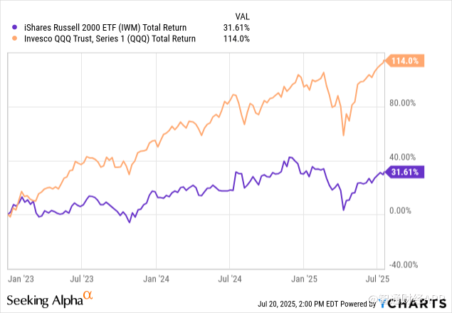 纳斯达克100指数和罗素2000指数的表现存在较大差异,可以清晰地反映这一问题。如果没有持有大型科技股,那么投资组合很可能多年来一直持平或仅小幅上涨。