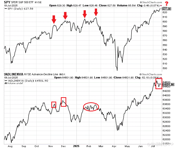 在过去一周的交易中,纽约证券交易所股票的涨跌线大幅下移,进一步印证了上行态势的疲软。当基准股指持续创下52周新高,而许多个股却开始出现反向走势时,投资者应该得出一个结论:市场即将陷入困境。