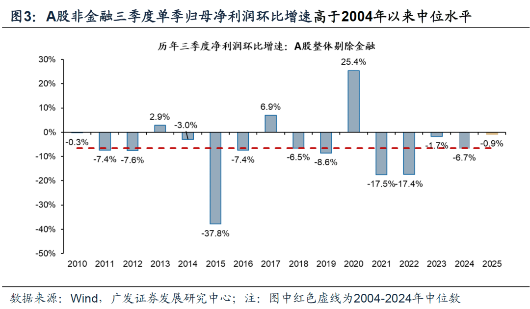 全A非金融业绩回暖,Q3单季归母净利润环比高于2004年以来同期中位水平。A股非金融三季报累计营收同比增速+0.31%(中报同比-0.56%);A股非金融三季报累计归母净利润同比增速+1.65%(中报同比+0.89%)。