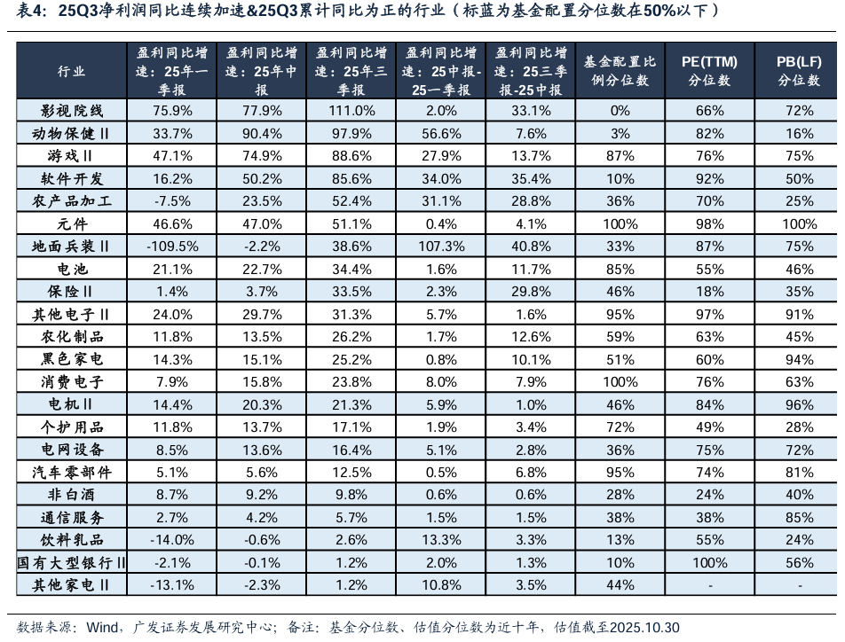(5)净利润同比连续两个季度加速&中报累计同比为正的行业集中于:TMT(影视院线、游戏、软件开发、元件、其他电子、消费电子、通信服务)、必需消费(动物保健、农产品加工、非白酒、饮料乳品)、中游制造(地面兵装、电池、电机、电网设备)、可选消费(黑色家电、个护用品、汽车零部件、其他家电)。