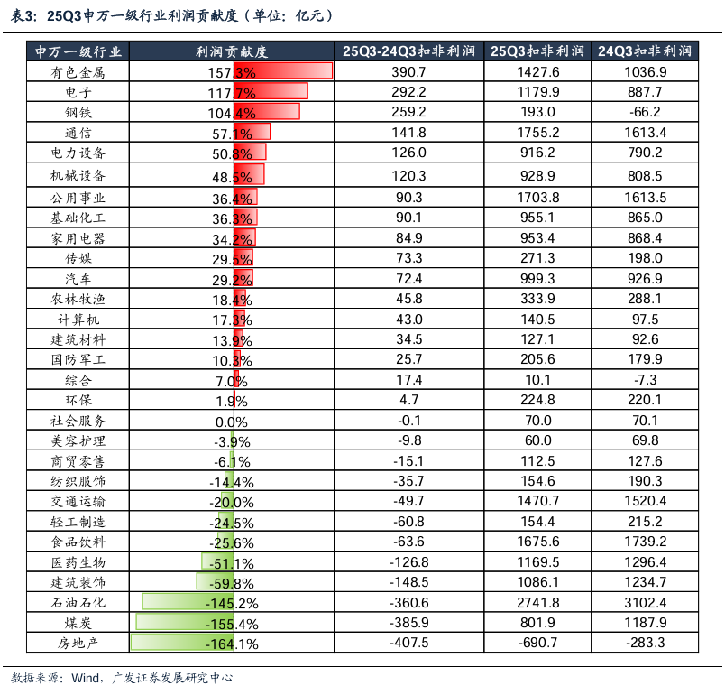 (4)从利润贡献度来看:剔除金融板块后,有色金属、电子、钢铁、通信、电力设备是三季报业绩回升的主因,而房地产、煤炭、石油石化、建筑装饰、医药生物对三季报依然构成较大拖累。