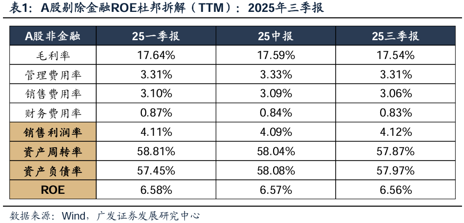 A股非金融ROE连续三季度走平,销售利润率提振,资产周转率拖累。A股非金融25年三季报ROE(TTM)为6.56%,相对于25年中报的6.57%下行0.01pct。