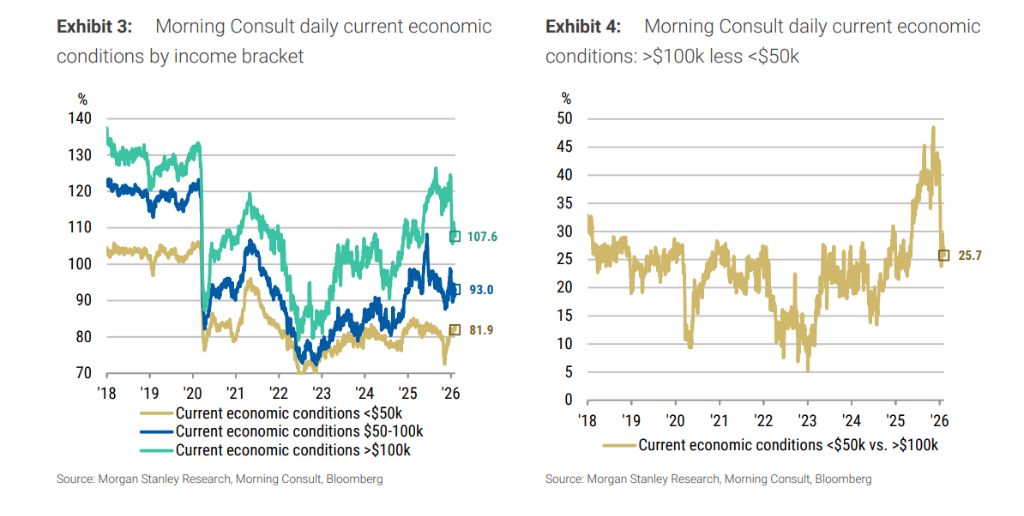 摩根士丹利观察到,作为消费主力的上层收入群体(年收入超过10万美元),其对当前经济状况的看法自今年年初以来发生了显著转变。