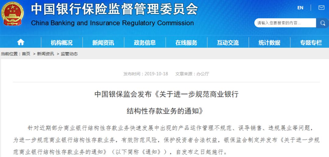 10月10日,银保监会发布《关于开展银行保险机构侵害消费者权益乱象整治工作的通知》,明确要整顿银行存在的结构性存款假结构,替代保本理财,或按保本产品宣传销售等侵害消费者权益的行为。