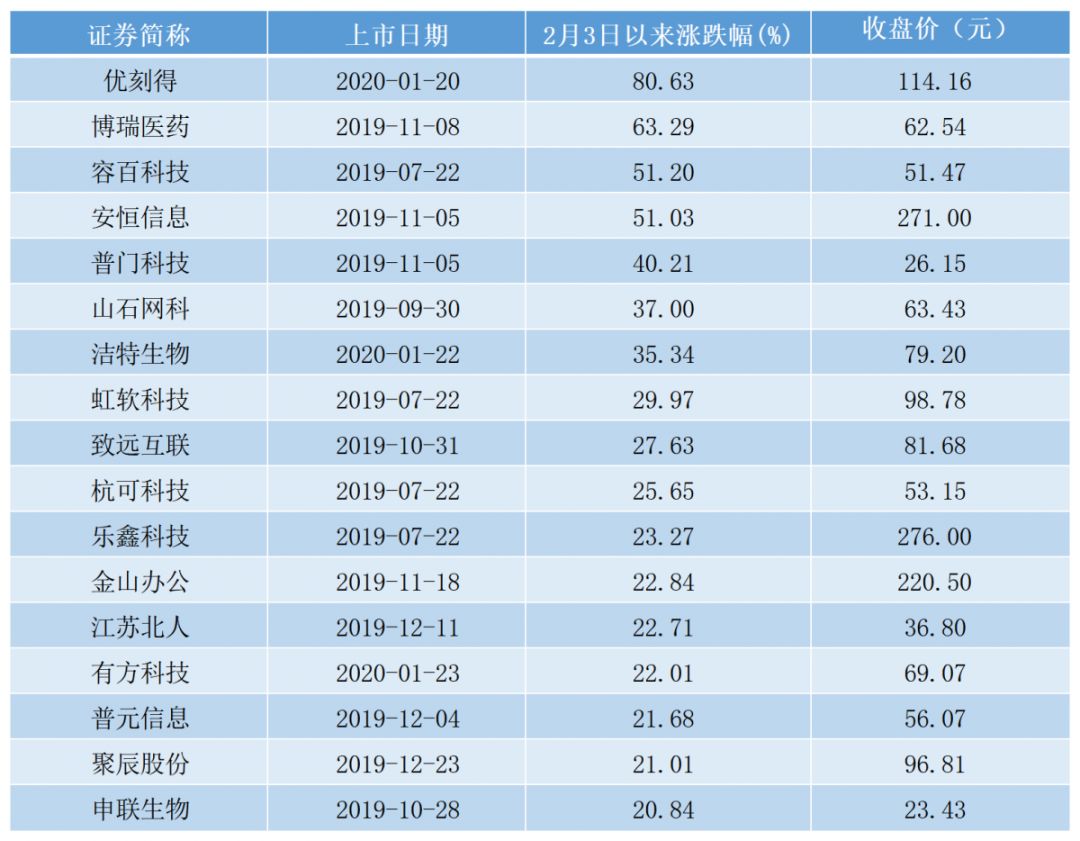 从2019年7月正式上市到至今,科创板经历了爆炒—降温—反弹,而目前又正处于科创板探底回升阶段。鼠年开市以来,科创板股票率先引领飙升行情。2月3日以来,科创板个股平均涨幅为11.61%,有84.52%的科创板个股股价上涨。如果从1月1日开始计算,科创板年内平均涨幅则达到30.62%,其中中微公司、虹软科技、芯源微股价实现翻倍,博瑞医药、安恒信息涨幅也均超过90%。
