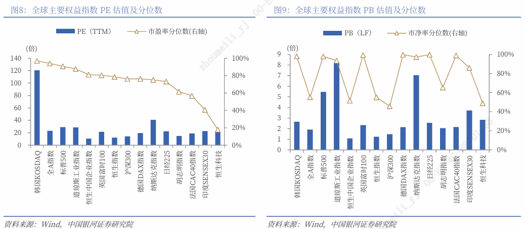恒生指数:市盈率(PE)12.09倍、市净率(PB)1.23倍,分别处于2010年以来79%、55%分位数水平,估值相对偏高。