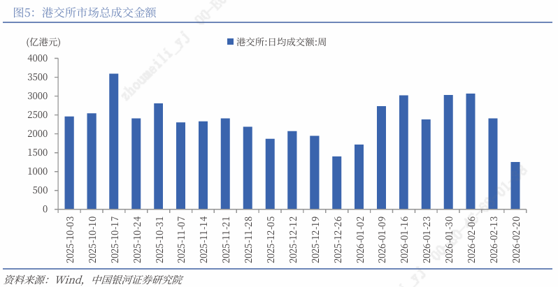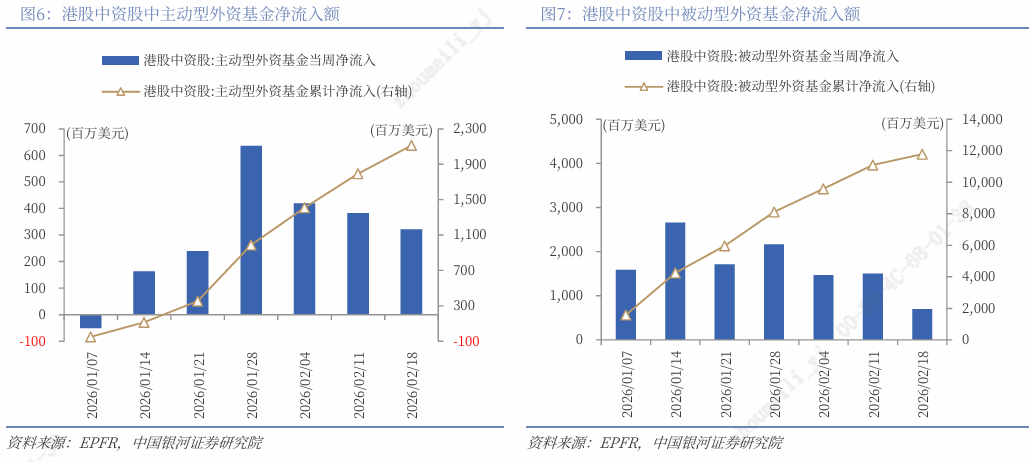 资金流向:截至2月18日的近7天数据显示,全球主动型与被动型外资基金对港股中资股的净流入额分别为3.21亿美元、6.97亿美元,较上周均有所减少。同时,上周港股通因假期暂停交易。