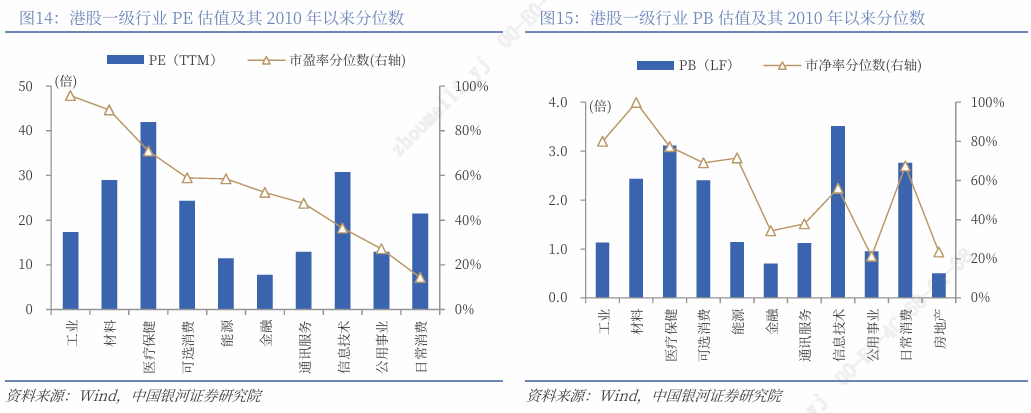 估值低位行业:日常消费、公用事业、信息技术、通讯服务的PE估值均低于2010年以来50%分位数,处于历史中低水平。