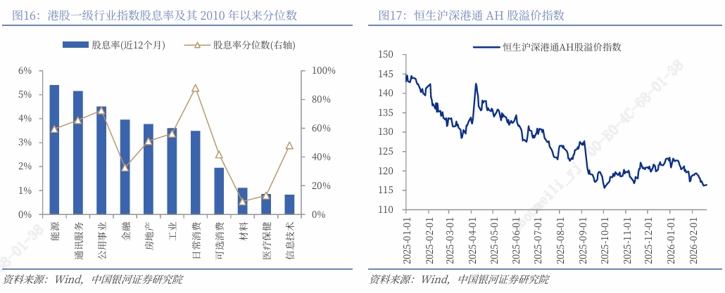 高股息板块:能源业、通讯服务业股息率超5%,公用事业股息率超4%,均处于历史较高分位,具备稳定收益特征。