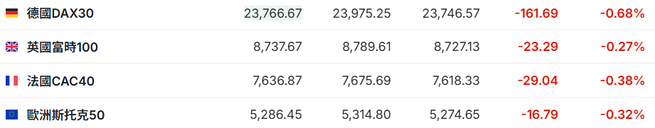 2. 截至发稿,德国DAX指数跌0.68%,英国富时100指数跌0.27%,法国CAC40指数跌0.38%,欧洲斯托克50指数跌0.32%。