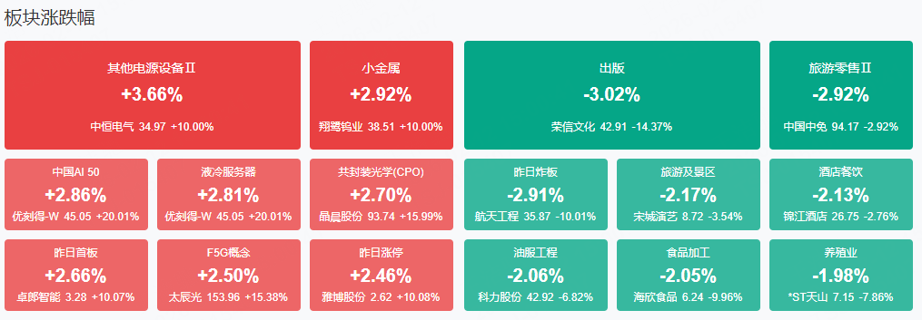 板块方面,AI硬件、电网、稀土等板块表现活跃,影视院线、消费等板块表现落后。截至收盘,沪指涨0.05%,深成指涨0.86%,创业板指涨1.32%。