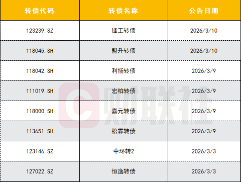 据财联社统计,截至3月10日,3月以来新官宣强赎的标的包括安集转债、力诺转债、宏柏转债、利扬转债、锋工转债,此外凤21转债、信服转债、嘉元转债、松霖转债等标的也已进入强赎倒计时阶段。