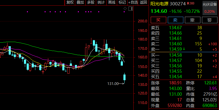 今日,阳光电源(300274)股价遭遇大幅下挫,开盘便呈现跳水走势,盘中跌到131元,跌幅一度突破13.1%。截至中午收盘跌幅达到10.72%,市值为2791亿元。