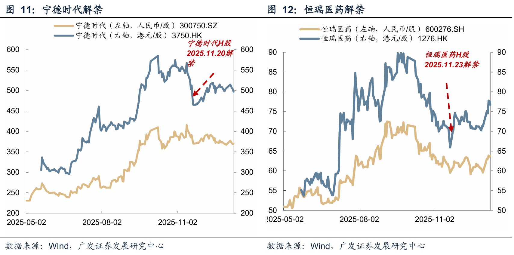 真正风险点在于解禁潮而非IPO本身。港股主板上市后6个月的基石投资者解禁,往往对市场形成压力。历史数据显示,2011年中、2015年下半年、2019年3月、2021年二季度、2022年年中等解禁高峰期,与港股调整时段高度重合。个股层面,如2025年11月宁德时代和恒瑞医药在解禁前一周均出现明显回调,解禁完成后才逐步企稳回升。