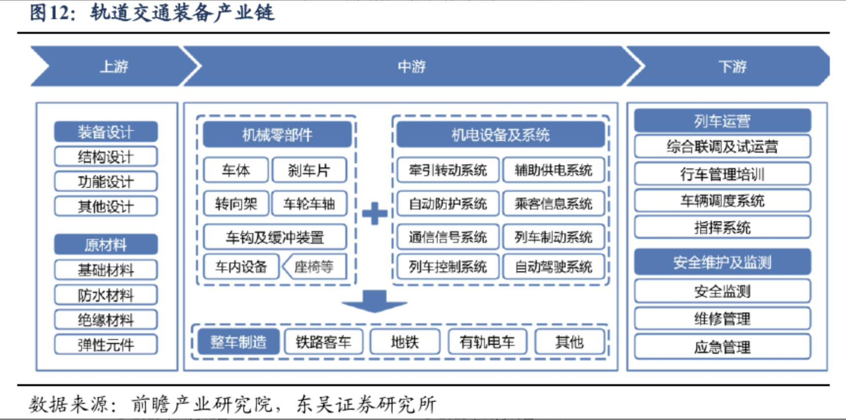 动车组产业链,核心供应商:中国中车(整车及核心部件)、思维列控(监控产品)、时代电气(牵引系统)、中国通号(ATP)、时代新材(减振降噪部件)、康尼机电(车门)、今创集团(内饰)、永贵电器(连接器)、博深股份(轮对)等。