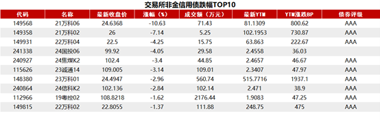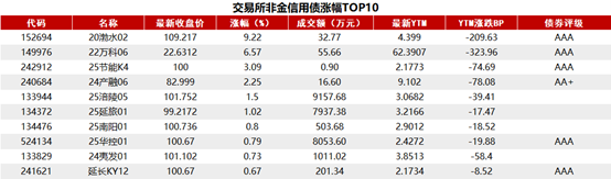 交易所债券市场收盘,据Choice 数据统计显示,今日交易所市场非金信用债涨幅排行前五的分别是:20渤水02、22万科06、25节能K4、24产融06、25涪陵05。具体如下: