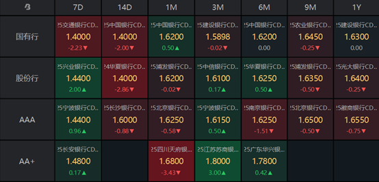 一级存单方面,今日3M国股在1.56%-1.62%位置需求较好,1Y期国股报在1.61%-1.62%的位置。二级存单方面,6M国股成交在1.6200%附近(较前一日变化不大),1Y国股成交在1.6300%的位置(较前一日下行1.25BP)。