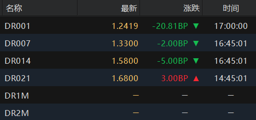 银银间回购定盘利率表现分化。FDR001持平报1.28%;FDR007跌2.0个基点报1.42%;FDR014涨2.0个基点报1.65%