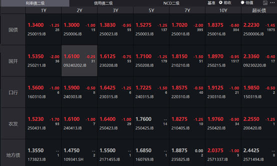 具体来看,银行间主要利率债收益率全线下行,截至下午16:30,10年期国债活跃券250016收益率下行0.6bp报1.8375%,30年期国债活跃券2500006收益率下行1.45bp报2.223%,10年期国开活跃券250215收益率下行0.95bp报1.897%。