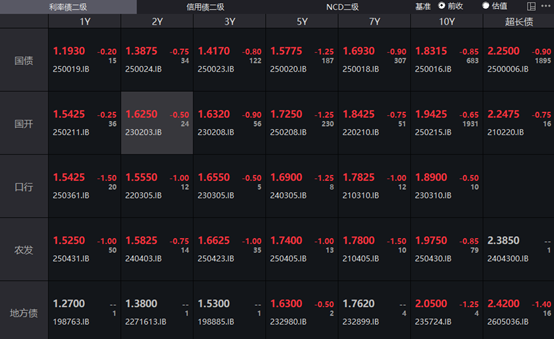 银行间主要利率债收益率全线下行,截至下午16:30,10年期国债活跃券250016收益率下行0.85bp报1.8315%,30年期国债活跃券2500006收益率下行0.9bp报2.25%,10年期国开活跃券250215收益率下行0.65bp报1.9425%。