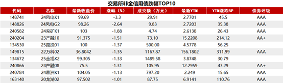 据Choice 数据统计显示,今日交易所市场非金信用债跌幅排行前五的分别是:24风电K1、24风电G2、24兖矿K1、23产融10、25昆投01。具体如下: