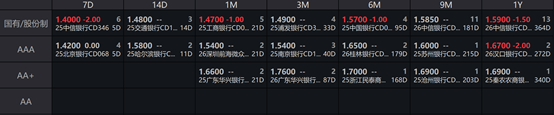 一级存单方面,今日3M国股在1.56%-1.57%位置需求较好,1Y期国股报在1.58%-1.61%的位置。二级存单方面,6M国股成交在1.5700%附近(较前一日下行1BP),1Y国股成交在1.5900%的位置(较前一日下行1.5BP)。