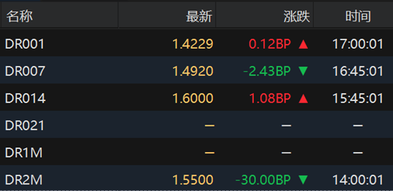 银行间回购定盘利率多数持平。FR001持平报1.5%;FR007持平报1.55%;FR014涨1.0个基点报1.61%。