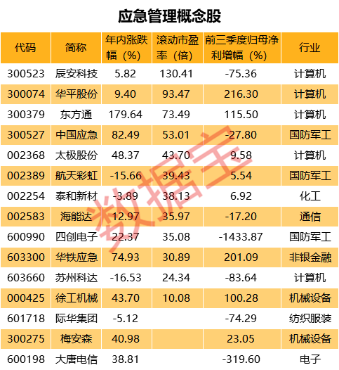 证券时报·数据宝统计显示,在A股市场,有10多只股票与应急管理相关,包括中国应急、辰安科技、东方通等。