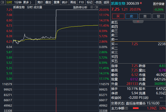 午后,医药股突然拉升,凯普生物直线涨停,海王生物、科华生物、迈克生物、金迪克等股票也陆续封死涨停板。此前,华兰疫苗、鲁抗医药、达安基因等个股已涨停。截至下午收盘,生物疫苗、流感指数涨幅超过3%,体外诊断、肝炎指数涨超2%。