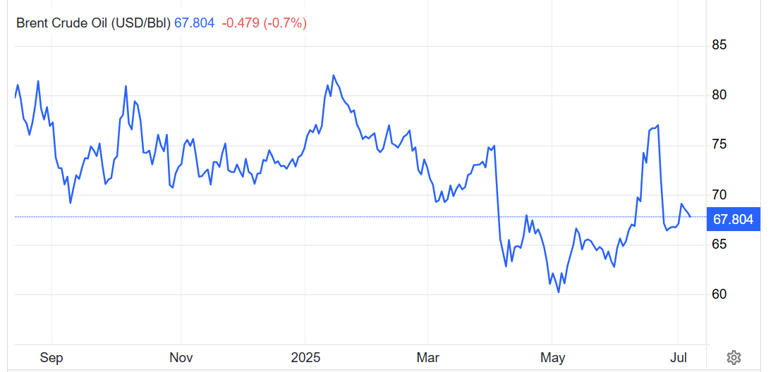 周一,布伦特原油期货价格下跌逾 1%,跌至每桶67美元,延续了上周在欧佩克+加速增产预期之后的跌势。欧佩克+同意在 8 月份将产量提 高54.8万桶/日,高于之前每月41.1万桶/日的市场预期增幅。此举将使八个超级产油国自愿减产 220 万桶/日的近80%回归市场。