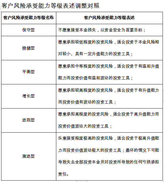 调整后,交行产品风险等级依旧分为六大类,但是名称已经改变,分别为1R(保守型)、2R(稳健型)、3R(平衡型)、4R(增长型)、5R(进取型)和6R(激进型)。