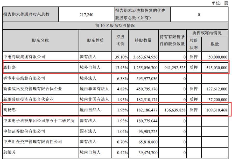 不过,截至今年三季度末,龚虹嘉和胡扬忠所持海康威视的股份限售比例较高,同时有不小规模的质押。