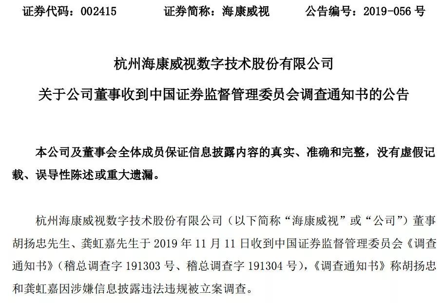 海康威视两名董事因涉嫌信息披露违法违规被证监会立案调查!