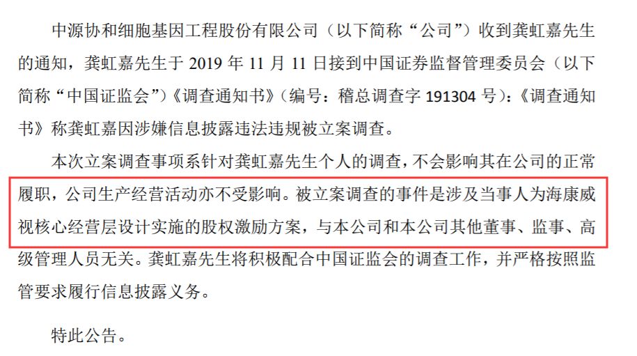 中源协和也于13日晚公告,龚虹嘉因涉嫌信息披露违法违规被证监会立案调查。本次立案调查事项系针对龚虹嘉个人的调查,不会影响其在公司的正常履职,公司生产经营活动亦不受影响。被立案调查的事件是涉及当事人为海康威视核心经营层设计实施的股权激励方案,与本公司和本公司其他董事、监事、高级管理人员无关。