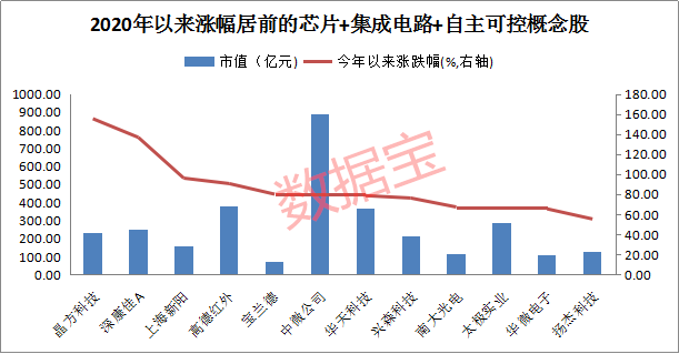 在国家各种政策支持下,芯片、集成电路相关公司股价表现亮眼。不过,2020年以来,仍有12家公司股价下跌,跌幅较大的有实达集团及中国长城,前者股价下跌25.62%,属于自主可控概念,后者股价下跌12.4%,同时具有自主可控和芯片国产化概念。股价涨幅超50%的公司有17家,晶方科技、深康佳A股价翻倍,上海新阳、高德红外、华天科技等6股今年以来股价涨幅均超过75%。
