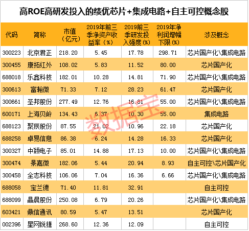 据此,根据条件,最新市值低于300亿,2019年前三季净资产收益率超过5%,且研发投入强度超过10%,经过筛选,15股浮出水面,包括圣邦股份、星网锐捷、景晨股份、北京君正等。