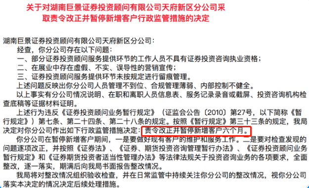 2月20日,四川证监局官网公示的一则行政监管措施决定书显示,对湖南巨景证券投资顾问有限公司天府新区分公司采取了责令暂停新增客户六个月的监管措施。