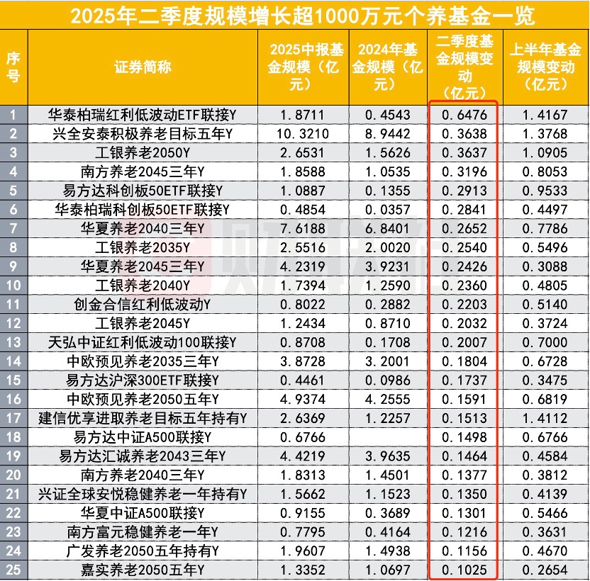 从趋势而言,个人养老资金正在加速奔赴红利低波策略、指数产品流入,在二季度末规模前五的个人养老金权益类指数基金中,有三只产品跟踪红利类指数,比如华泰柏瑞红利低波ETF联接Y,全市场规模增长最高,二季度增加6476万元。