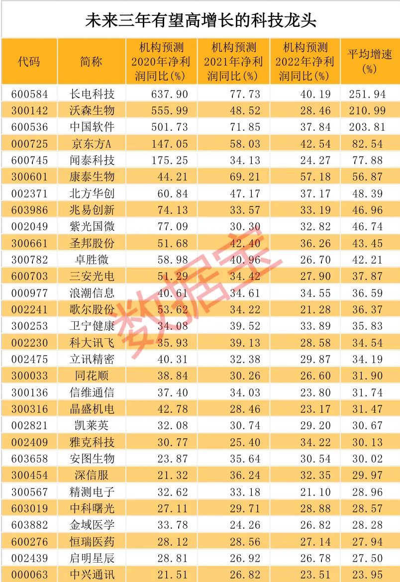 在接下来的几年时间里,谁会是成长性最高的科技龙头?根据5家以上机构一致预测数据, 2020年、2021年及2022年三年净利润预测增幅均超过20%的公司共计30家,包括5G通信设备龙头中兴通讯、智能医疗龙头卫宁健康、生物疫苗龙头康泰生物等。