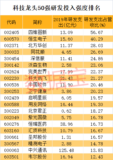 从研发投入强度来看,“科技龙头50强”公司远胜于A股整体水平。数据显示,50家科技龙头公司去年研发支出占营收比均值为13.98%,是A股整体均值的6.3倍。研发投入强度最高的前三位依次是四维图新、恒生电子、北方华创。