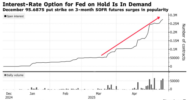 一种反向押注美联储今年不会降息的押注正在期权市场掀起热潮。该头寸采取看跌期权的形式——持有者有权在规定的时间窗口内以2025年12月的有担保隔夜融资利率期货合约的特定价格卖出。该期货合约与美联储设定的利率密切相关。执行价格为95.6875,低于当前期权价格——预计到年底将降息近三次25个基点。当期权价格跌向执行价格时,期权的价值将上升,如果不再预期降息,就会发生这种情况。