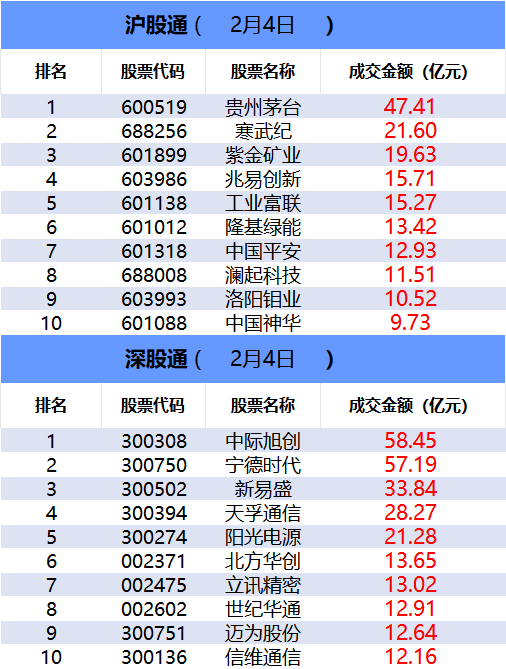 从沪股通前十大成交个股来看,贵州茅台位居首位;寒武纪和紫金矿业分居二、三位。