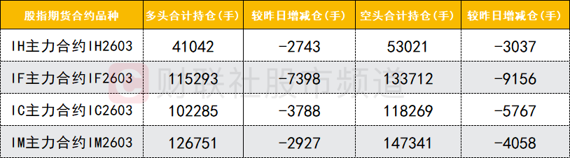 四大期指主力合约中,IH、IF、IC、IM合约多空双方均减仓,且空头减仓数量较多。