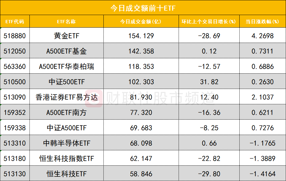 从成交额前十的ETF来看,黄金ETF(518880)成交额位居首位,A500ETF基金(512050)成交额位居次席。