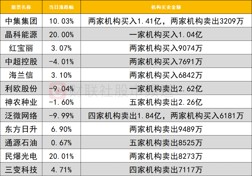 今日龙虎榜机构活跃度有所降低,买入方面,化工人气股红宝丽遭多路资金激烈博弈,获两家机构买入0.9亿,同时深股通买入0.69亿。2连板的中集集团获两家机构买入1.41亿,同时遭两家机构卖出3209万。