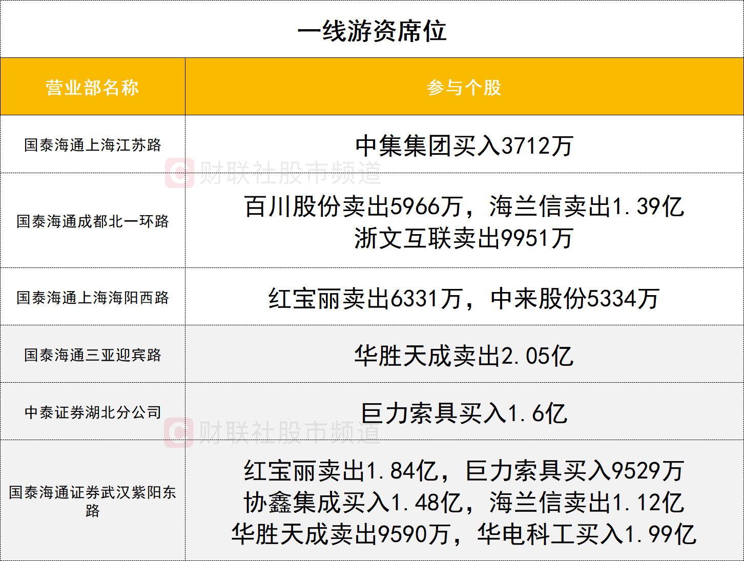 一线游资活跃度一般,商业航天概念股海兰信盘中冲高回落,两家游资(国泰海通证券成都北一环路、国泰海通证券武汉紫阳东路)分别卖出1.39亿、1.12亿。红宝丽获两家一线游资(国泰海通证券武汉紫阳东路、国泰海通证券上海海阳西路)合计卖出2.47亿。