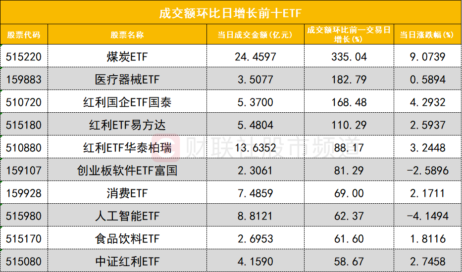 从成交额环比增长前十的ETF来看,煤炭ETF(515220)成交额环比增长335%位居首位;医疗器械ETF(159883)成交额环比增长182%位居次席。